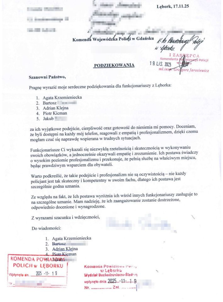 Pięcioro funkcjonariuszy z Komendy Powiatowej Policji w Lęborku otrzymało list z podziękowaniami od mieszkanki, pokrzywdzonej w wyniku kradzieży z włamaniem. Autorka listu wyróżniła ich zaangażowanie, cierpliwość oraz gotowość do niesienia pomocy, które przyczyniły się do ujęcia sprawcy.